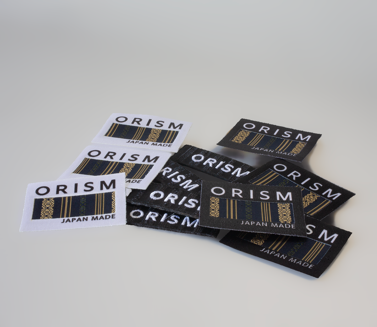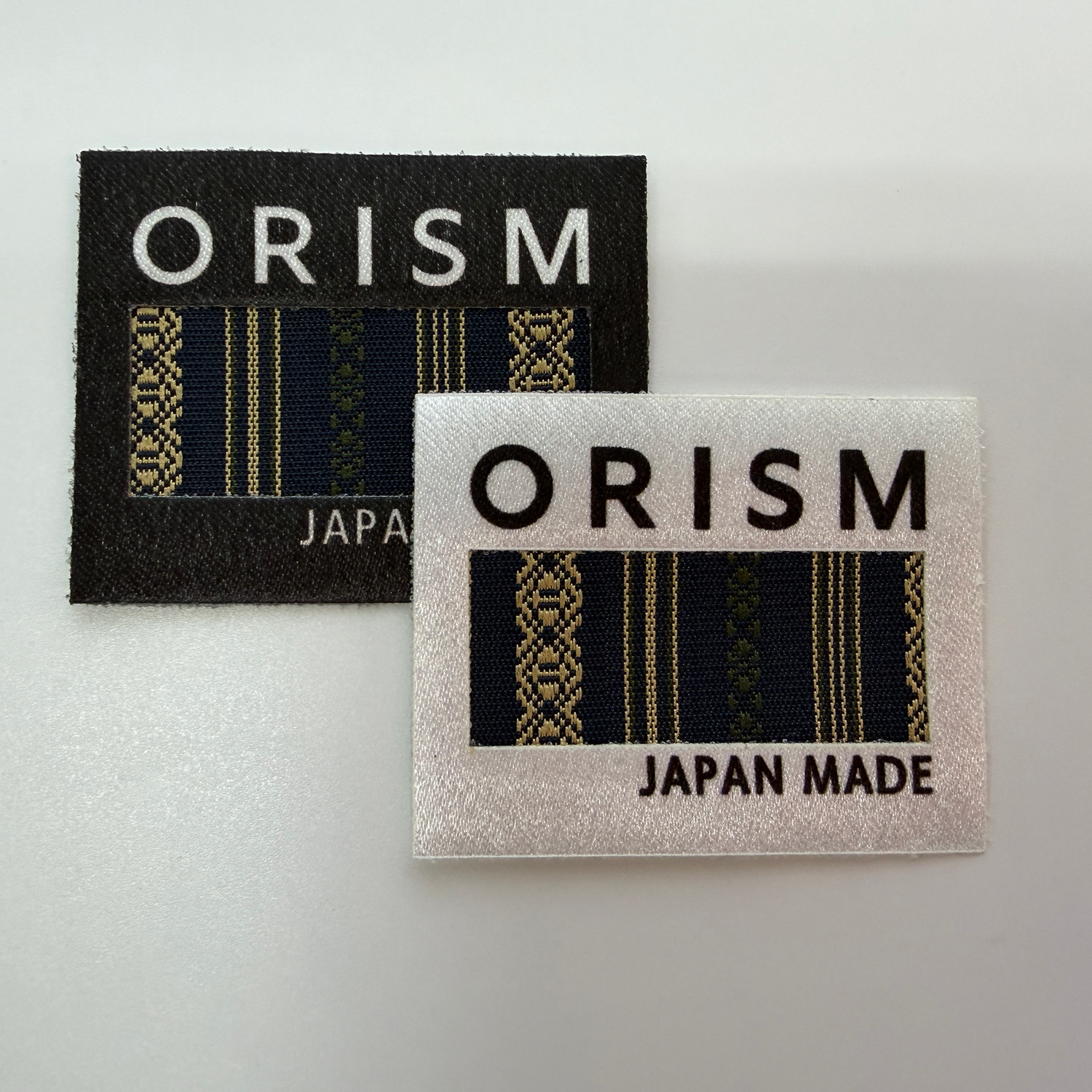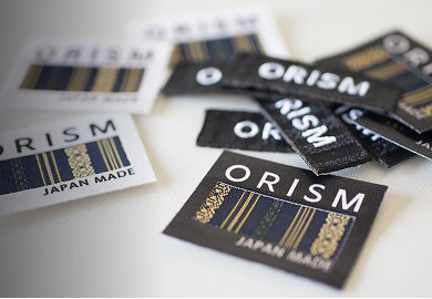 ORISMが使用する博多織生地は、博多織工業組合加盟の歴史ある織元が最上級の絹糸を用いて製造しています。これを特別に加工して製作したORISMオリジナルの「ワッペン」・「刺繍ワッペン」・「ピスネーム」(二つ折りのタグ)は、ギャランティーとしての役割を果たすとともに、ブランドフィロソフィー、コンセプト、そして福岡発ブランドとしてのプライドを象徴するものとしてアパレル製品を中心に取り付けられています。